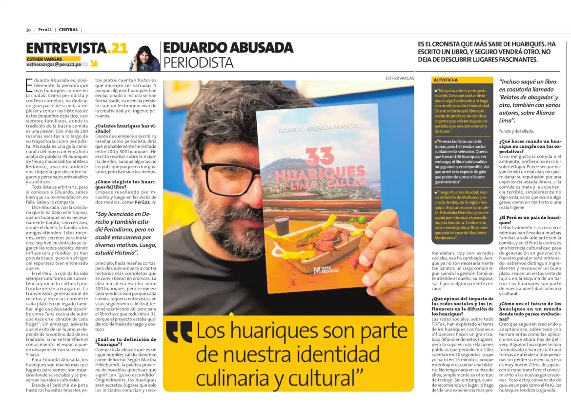 Entrevista a Eduardo Abusada en el Diario Perú21 a propósito de la publicación de “33 huariques de Lima y Callao”. Dice la nota a cargo de Esther Vargas: Es el cronista que más sabe de huariques. Ha escrito un libro, y seguro vendrá otro. No deja de descubrir lugares fascinantes (13/01/2025).
